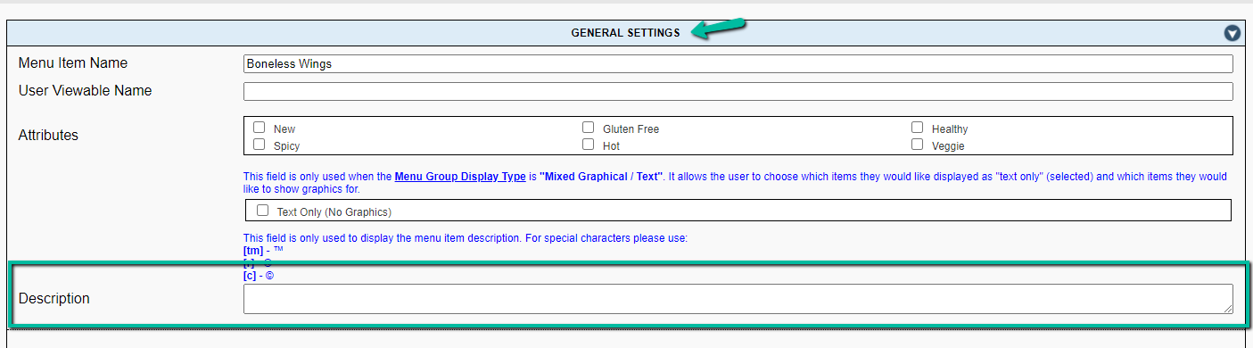 6. Under 'General Settings' find the text box labled 'Description'. Add or edit the text within the box.