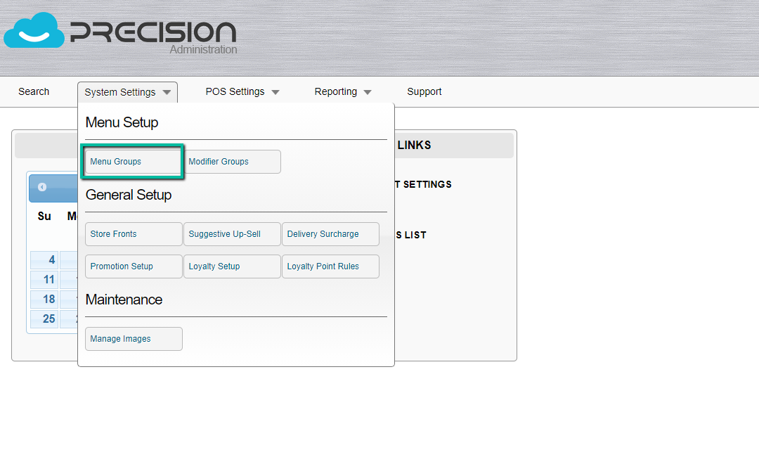 1. Log in to the web admin panel with your username and password. If you do not have an account yet, please contact support at support@precsionpos.com. 2. Select 'System Settings' from the navigation bar. 3. Select 'Menu Groups' from the drop down ...